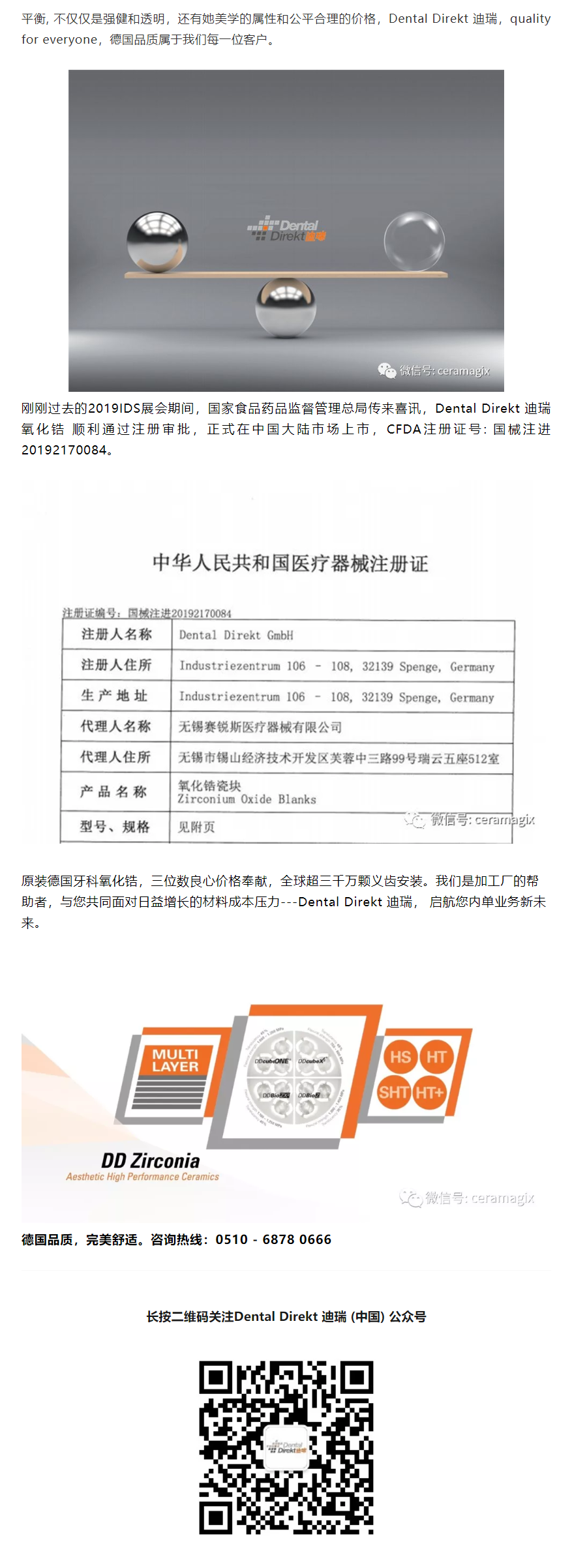 依托集团公司的陶瓷材料技术积累和强大的生产能力,Dental Direkt GmbH公司致力为全球客户提供最好的口腔材料。